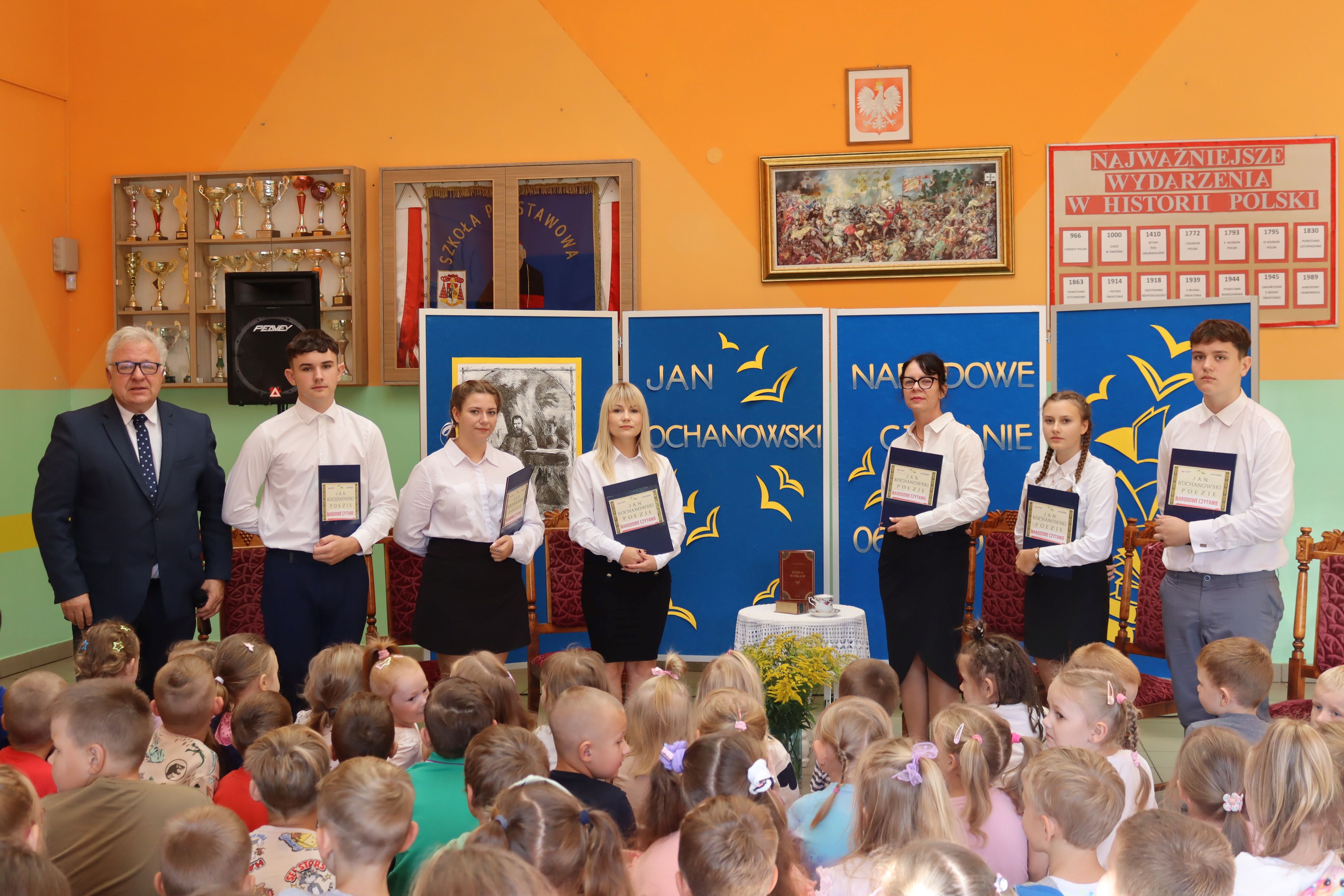 I warto zaznaczyć, że … słowa poezji Mistrza Jana z Czarnolasu w interpretacji naszego Koła Teatralnego wciąż „BezNazwy” … rozpływały się w szkolnej przestrzeni … Młodzi recytatorzy wybornie udźwignęli narodową misję … i z należytym szacunkiem czytali wybrane utwory … Dzielnie wspierani przez Panią Wioletkę i Panią Aldonkę …, które także zauroczyły zgromadzonych barwą swych głosów oraz interpretacją pieśni ojca polskiej literatury …