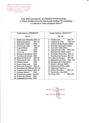 Lista dzieci przyjętych do klasy pierwszej na rok szkolny 2026/2027